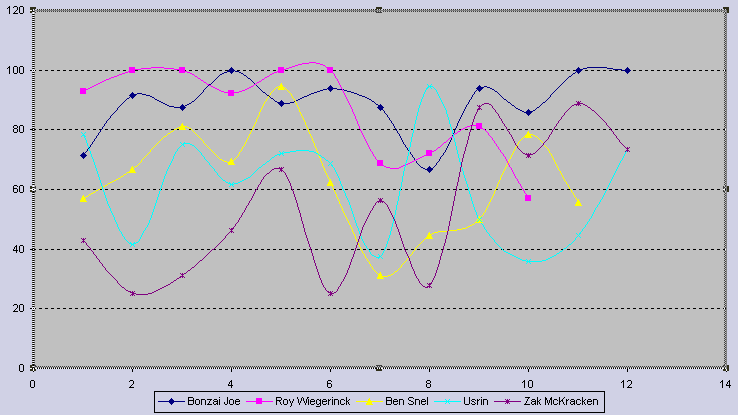 | Bonzai Joe | 71,43 | 91,67 | 87,5 | 100 | 88,89 | 93,75 | 87,5 | 66,67 | 93,75 | 85,71 | 100 | 100 | 1066,87 | 12 | 88,90542 |