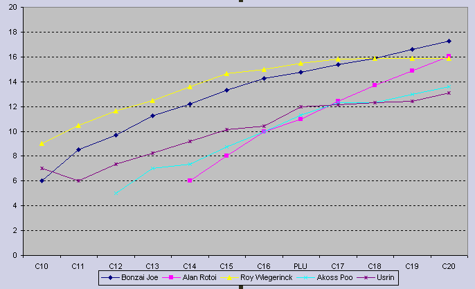 | Bonzai Joe | 6 | 8,5 | 9,6667 | 11,25 | 12,2 | 13,333 | 14,286 | 14,75 | 15,389 | 15,9 | 16,591 | 17,292 |