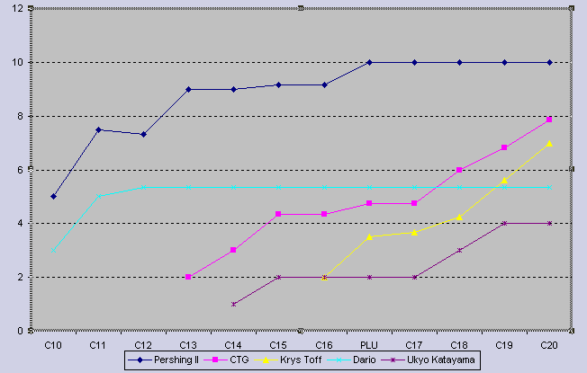 | Pershing II | 5 | 7,5 | 7,3333 | 9 | 9 | 9,1667 | 9,1667 | 10 | 10 | 10 | 10 | 10 |