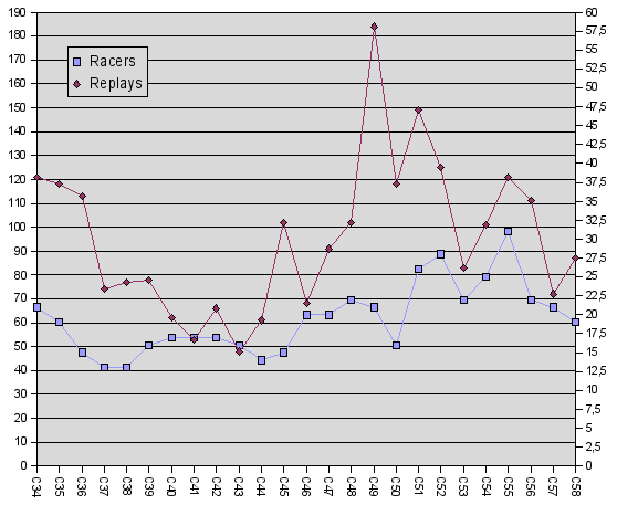 At the end of 2014 and the beginning of 2005 as more racers came, more replays were sent. The all-time-high replay number was on ZCT49, nearly the double of thw usual number! Then strangely as the racer number was on the run in the middle of 2005, the replay count was going down again - but still - it was higher than the average in 2004.