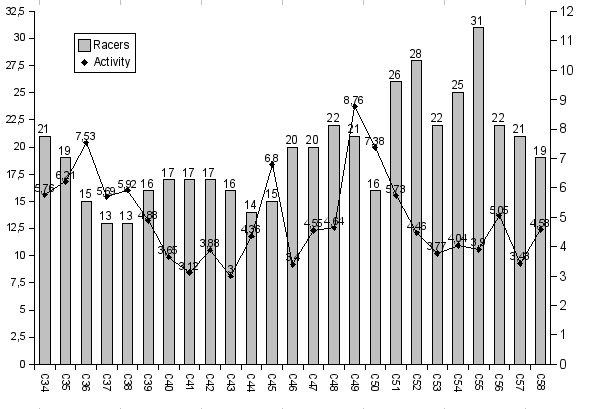 Then suprisingly as the end of the season comes by, activity still remains at the usual level, only a few tracks are exceptional (like ZCT45 and ZCT56), but they don't affect the general level of activity, it quickly falls back to the normal level. You can also notice, that usually after these excetionally popular tracks the next track has a weaker activtiy than usual. Probably racers lose their motivation after having an usual race after a great one.